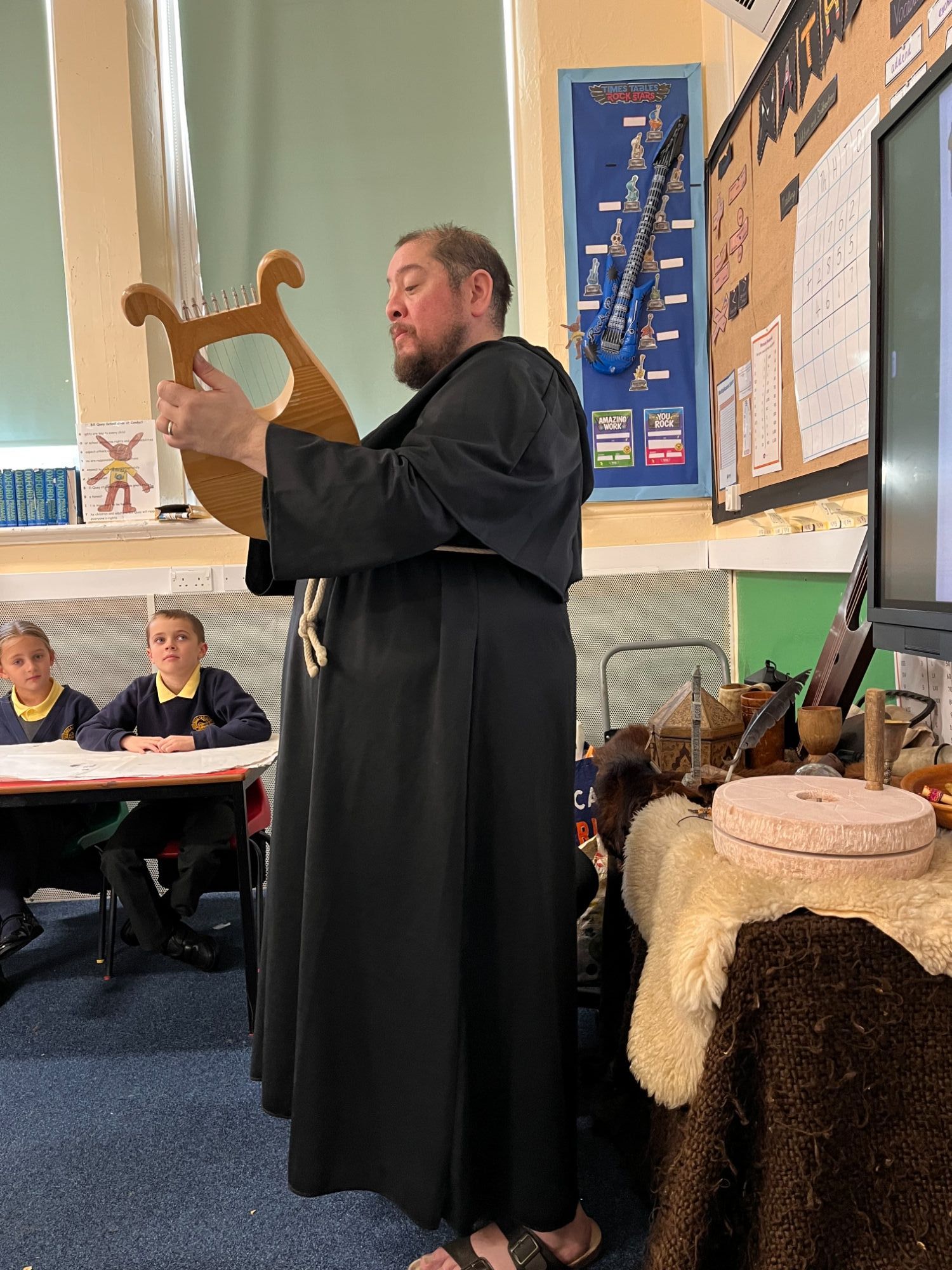 Year 4 enjoyed a fabulous afternoon with Richard, 'That History Bloke', learning all about the importance of Anglo Saxon monks.  They learnt about the different jobs that the monks did, their daily routine, games that they played and prayers that they would have sang.