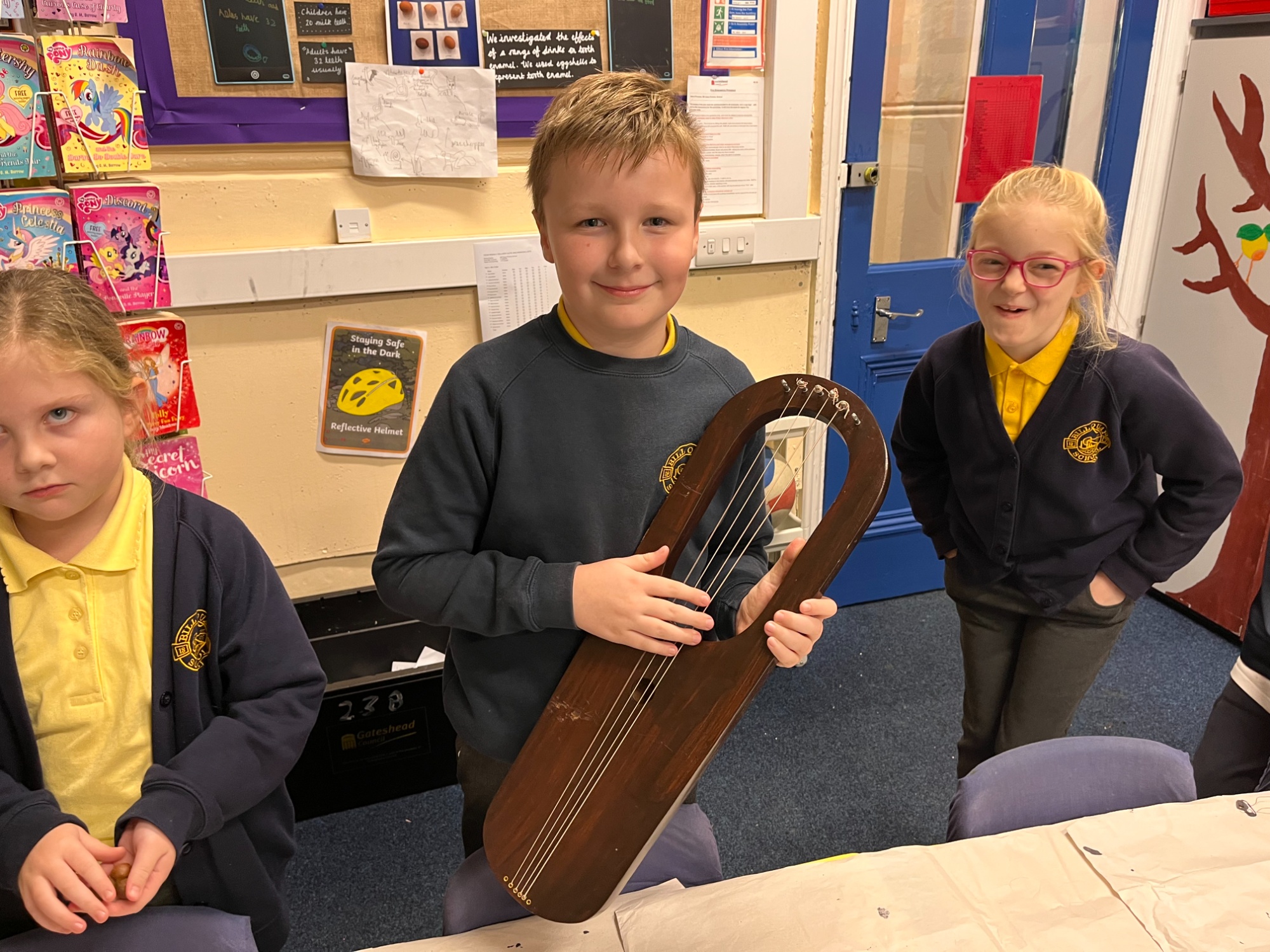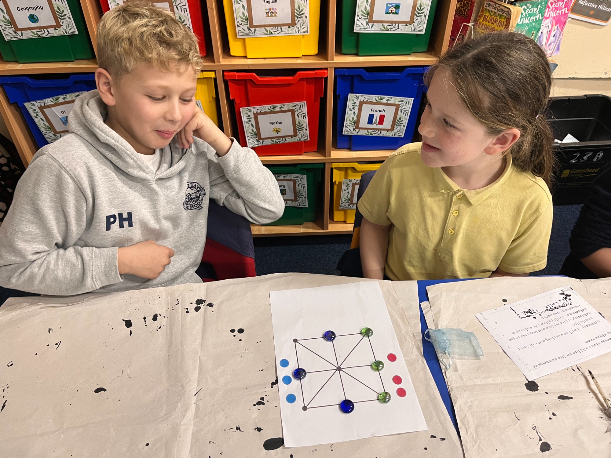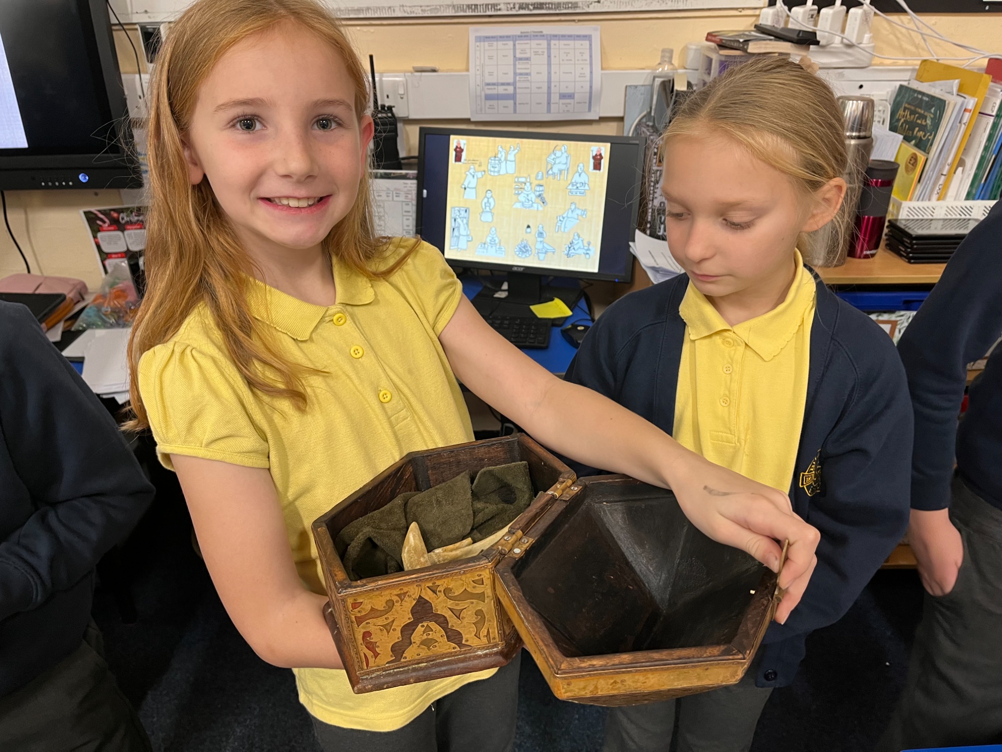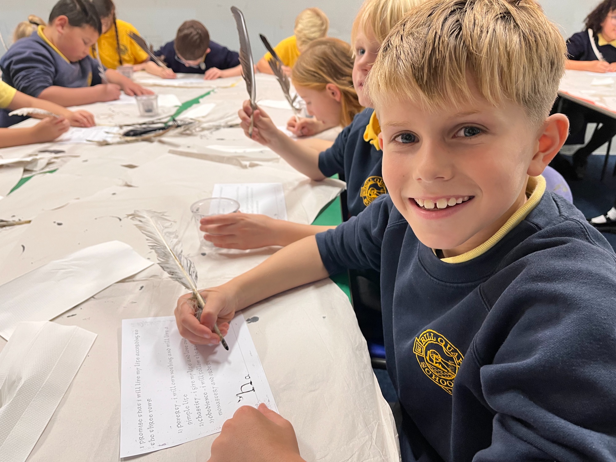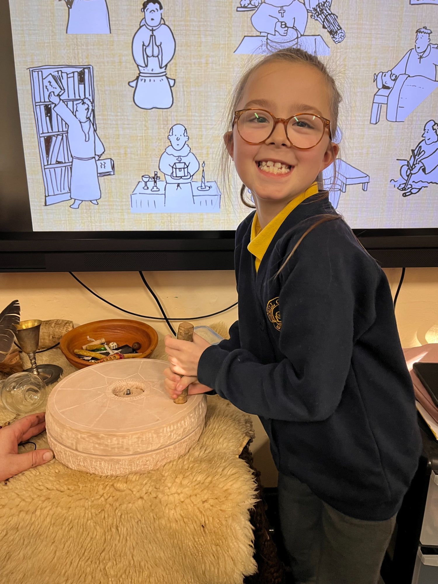 Pupils enjoyed exploring a whole range of replica artefacts from the period, learning Anglo Saxon words and playing a game that would have been popular with the monks.  They even got to try their hand at writing like the monks would have!