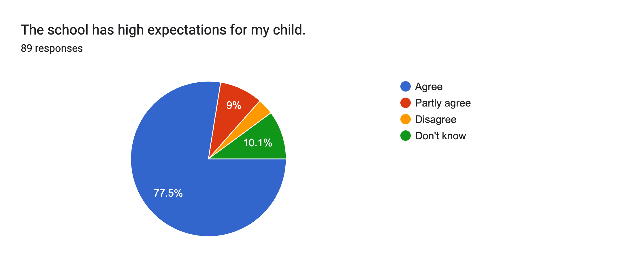 | The school has high expectations for my child. | 78% | 9% | 3% | 10% |